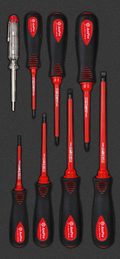 Приобрести T32193 Набор отверток диэлектрических 8пр. (VDE-1000V), тестер: 220В - 250В в мягком ложементе от компании AmPro (Тайвань) из раздела Ложементы мягкие (VA серия)