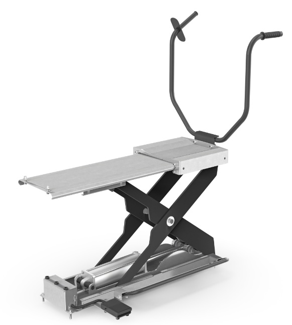 Нажимаем на педаль, подъемник поднимается до нужной высоты и подхватывает колесо, минимизируя нагрузку на вал.